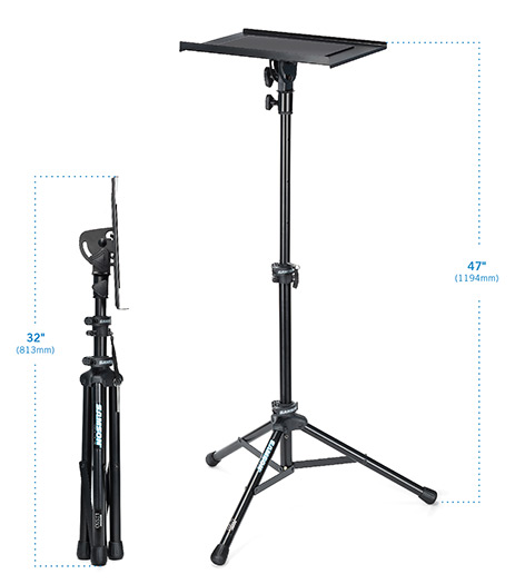Samson's LTS50 Laptop Stand offers convenient, comfortable placement of your laptop computer in live and studio environments. The lightweight LTS50 offers a roadworthy, steel-constructed design with a sleek black finish, as well as a removable top and fold-up design for increased portability. It's 15" x 11" laptop try features a silicon surface to hold your computer securely in place with tilt control for optimal positioning in any application. Adjustable 30" to 47" in height with locking latches and a pin lock for increased support, you can count on the LTS50 to keep your laptop right at your fingertips and ready to perform.