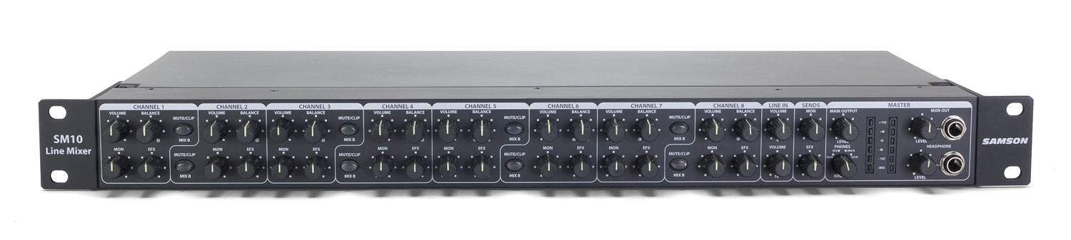 The SM10 features ten channels with 1/4" stereo line inputs and a balance control for each channel. Two channels include XLR mic inputs. This allows you to blend the relative levels of stereo inputs to your liking. In addition, each channel includes a switch for +4 dBu or -10 dBV line level input.
