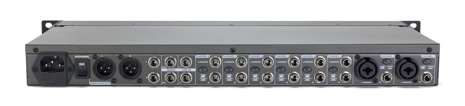 - Ten channels (eight 1/4" stereo line inputs, two combination XLR-1/4" inputs)